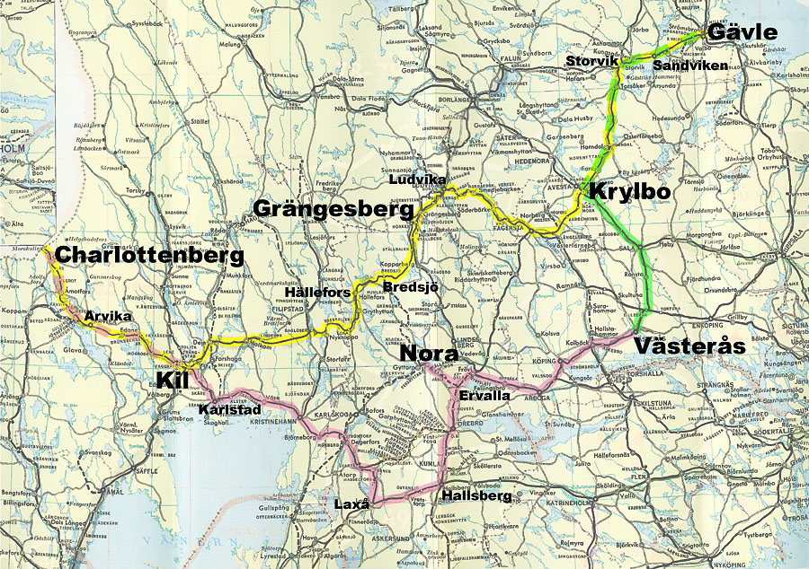 Reiseruten i Sverige framgår av kartet nedenfor. Gult angir strekninger som ble befart 8. september, grønt den 10. september og lysrødt den 11. september. Vi overnattet altså i Gävle to netter og i Västerås en natt.