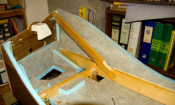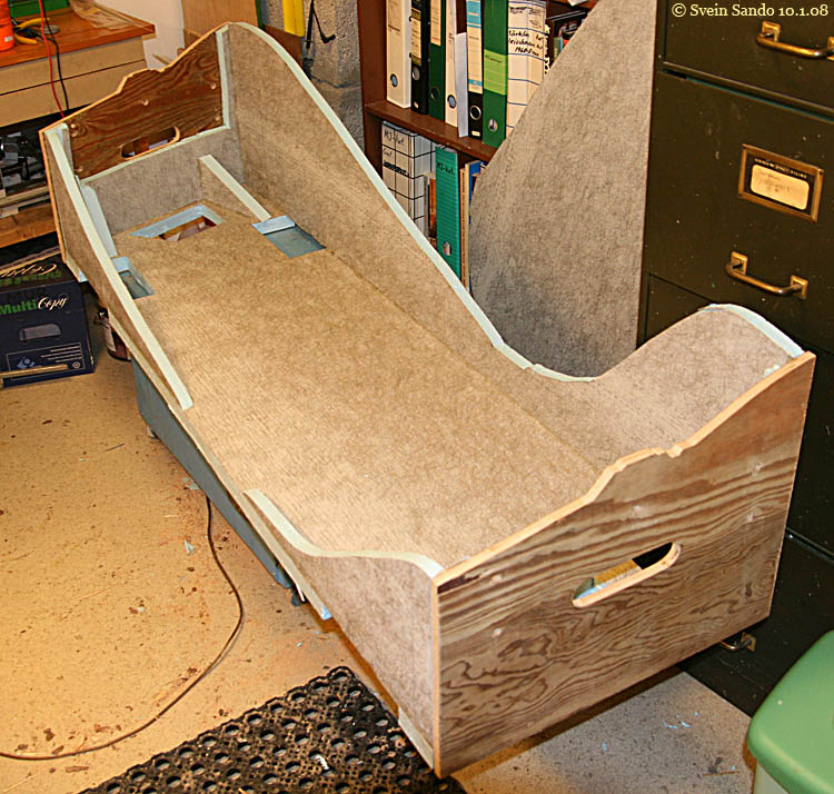 De to endestykkene i finér er montert og det er skåret ut hull i bunnen for tilgang til bolter fra undersiden.