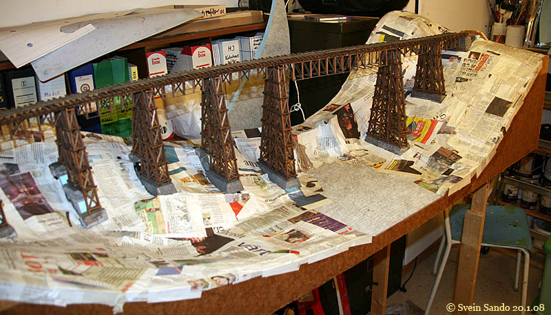 Parallelt med titting på sport på TV, fortsatte jeg med arbeide med å tilpasse fundamentet for broa. Flere fundamenter måtte lages på nytt, dels fordi jeg har endret på avtrappingen, dels fordi brokarene i hver ende krever spesialtilpassing siden de kommer rett over den sentrale bolten på endestykkene. Nytt murverk innebærer en omgang med å legge på sparkel utenpå kjernen, den må tørke og den må risses. Alt dette tar forholdsvis lang tid, særlig med tanke på antall pilarer og brokar på denne broa med så mange spenn.