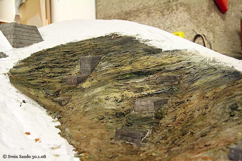 Som følge av kapping av noen pilarbein, måtte det lages noen nye pilarfundamenter. Det laget jeg av Litex. Men for å få til tørrmurimitasjonen, valgte jeg å bruke min gamle metode med skjøtmasse. Her er et av brokarene og en av pilarfundamentene bestrøket med skjøtmasse. Det må legges på så pass tykt (1-2 mm) at det er noe å risse inn i etterpå.