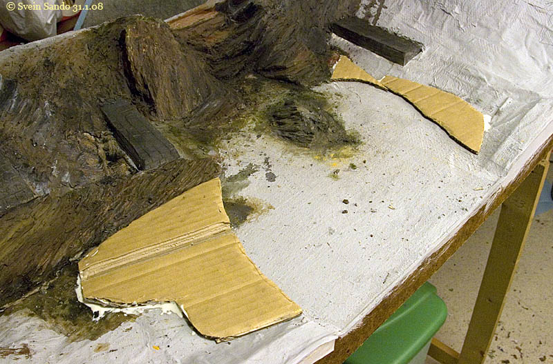 Etter litt testing og fundering om gamle landskapsdeler kunne brukes på nytt, blir det til at jeg lager det som meg er tradisjonell landskapsunderlag på modulen. Det er har dels med vekt å gjøre, dels med vansker med å tilpasse gamle deler til en så pass komplisert struktur som med alle disse brofundamentene. En liten fjellkanus fra tidligere anlegg får imidlertid sin plass ved siden av fossen som skal komme under broa. Flettverket av papp fra en eske til et PC-tastatur var nok til hele modulen.