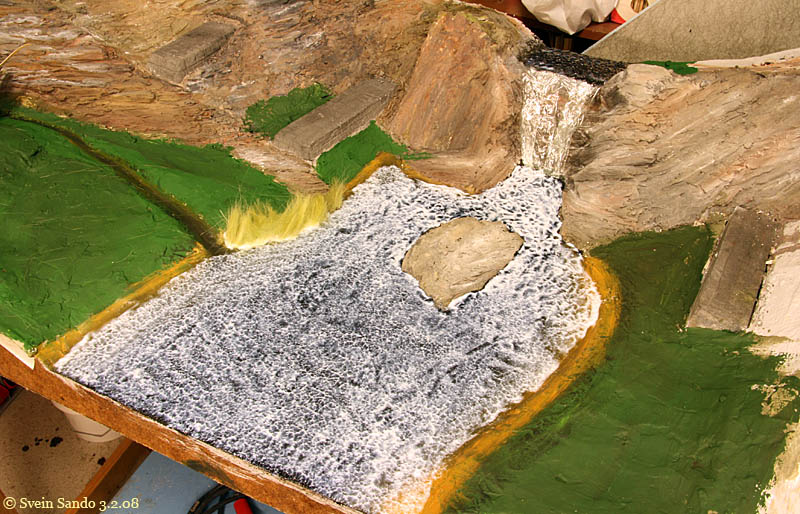 I en kunstmalerforretning (Østerli) kom jeg over akryllmasse fra Lucas med betegnelsen Kristalgel. Det lå en prøve i butikken og den så meget interessant ut med tanke på å modellere vann som ikke er helt flatt og jevnt slik det blir med lakk eller epoxy. Dette er altså en litt stiv gel som blir glassklar og blank når den tørker. Jeg ville prøve den på elva på denne modulen og trodde jeg hadde funnet en god betode for å vise mer liv i elva rett ved fossen (ennå ikke ferdig med å gjøre vannet urolig der) enn litt lenger vekk fra fossen. Jeg laget store bølger ved å trykke en spissavrundet palettkniv ned i massen og så dra den rett opp. Små bølger laget jeg ved å trykke en stor flat pensel loddrett ned i gelen og så dra den rett opp. I det jeg gjorde det, så det lovende ut. Da den hadde tørket, var jeg imidlertid ikke så sikker på hvor vellykket dette var. Krusningene ble rett og slett for fine, virker det som. Kanskje dette er en ok metode i en mindre skala som N eller Z, men i H0 blir krusningene for små, på størrelse med en håndflate omtrent. Sette fra siden i lav vinkel virker det som en stor fjord der vinden har laget let opprørt sjø.