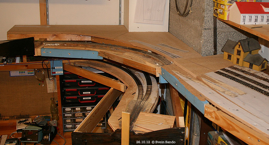 Så er det gått nesten to år siden det sist ble gjort noe på anlegget. Men når barnebarn har sett meg kjøre litt på anlegget på 2-3 meter avbrutte kjørestrekninger, og vil stadig "søre tåg i selleren til bestefar", er det ikke til stå for. Men banen må fullføres slik at togene kan kjøre ordentlig på anleget. Viktige deler som den uttagbare seksjonsdelen ved dør, som også binder det hele sammen, var første punkt på programmet.