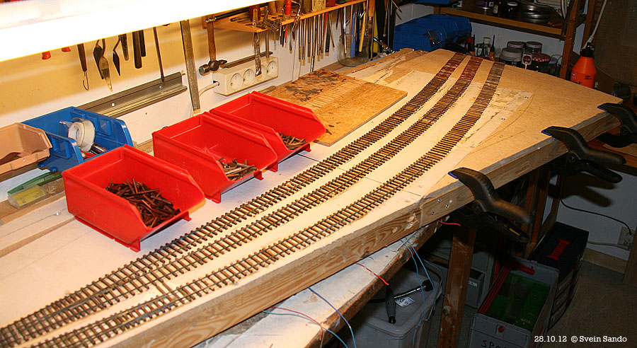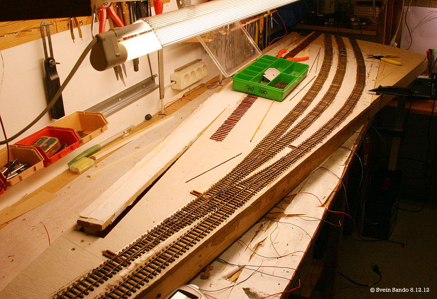 Det resterende sporleggingsarbeidet på den seksjonen som allerede hadde spor ble fullført med seksjonen på arbeidsbenk, slik bildene fra 8.12.12 viser. Det gav en atskillig bedre arbeidssituasjon enn om seksjonen skulle ligge på sin plass på anlegget. Ved selvbygget spor trenger man helt andre arbeidsforhold enn ved fleksispor, for ikke å se seksjonsspor. Men for å få lagt sporet over skjøtene mellom de to delene av Rogndalen stasjon, måtte begge seksjonene legges på sin egentlig plass slik at overgangen ble korrekt og skinnene på den tilstøtende seksjonene ende på riktig sted. Der skjøten er går det imidlertid an å komme til ganske greit hvis jeg står på en stol. Det er mange veksler i området her, så det var en 3-4 timers arbeid å få lagt på plass dette. Mange av vekseldelene er hentet fra tidligere anlegg, så alt dette er ikke nybygget nå.