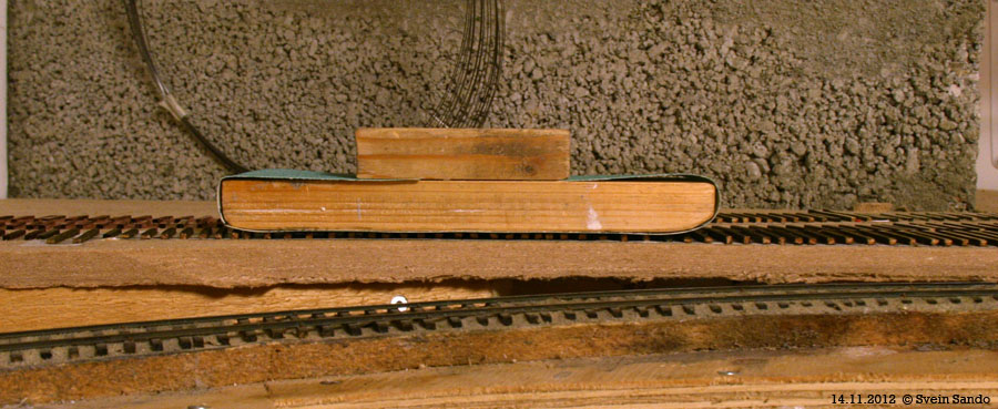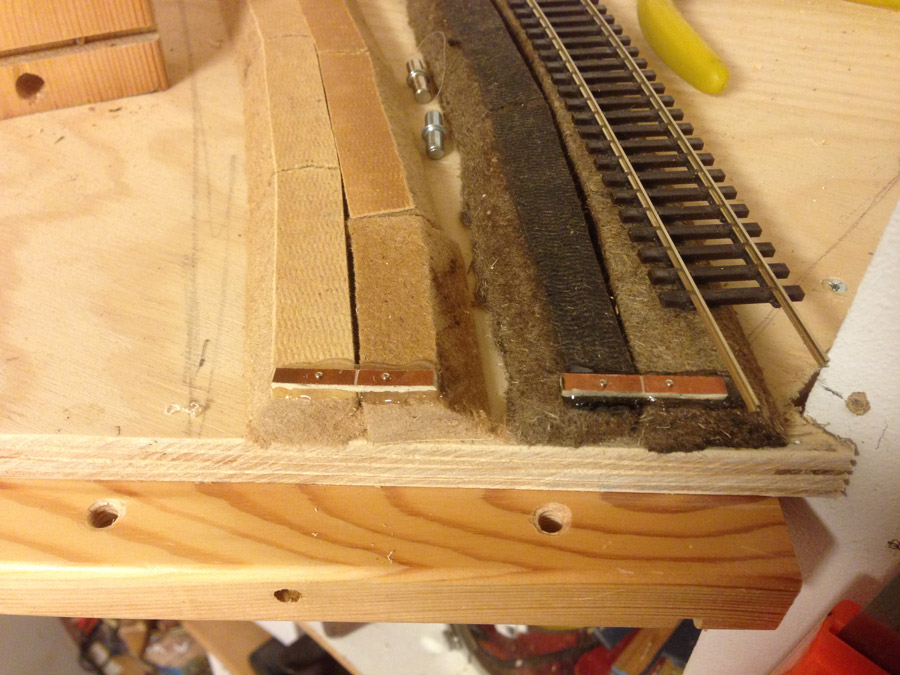 Nederste uttagbar seksjon. Utleggeing av underbygning pågår. Ved å splitte sporunderlaget (12 mm porøs plate) langsetter, er det lett å legge inn sporunderlaget etter en senterlinje.
