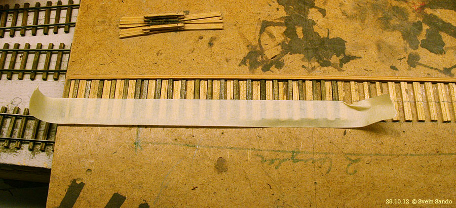 Skinneleggingen på de to broene har begynt. På broene ligger det fleksispor, mens på den ene "fastlandssiden" er det selvspikret spor. For å sikre lik høyde på skinnetopp, ble fleksisporet lagt litt (< 1 mm) svevende over underlaget men lasket til det selvspikrede sporet. Jeg limer fleksisporet med vanlig trelim. Ved å ha på litt godt med trelim, legger limet seg i det svevende mellomrommet inn mot skjøten, og når dette tørker, ligger sporet stabilt nok. Ballastering senere sikrer det helt. Bildet viser liming av en slik skjøt med godt med press på limet når det tørker. Laskene ble kappet over når det hele var tørket og fast, for broen skal jo kunne løftes ut.