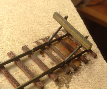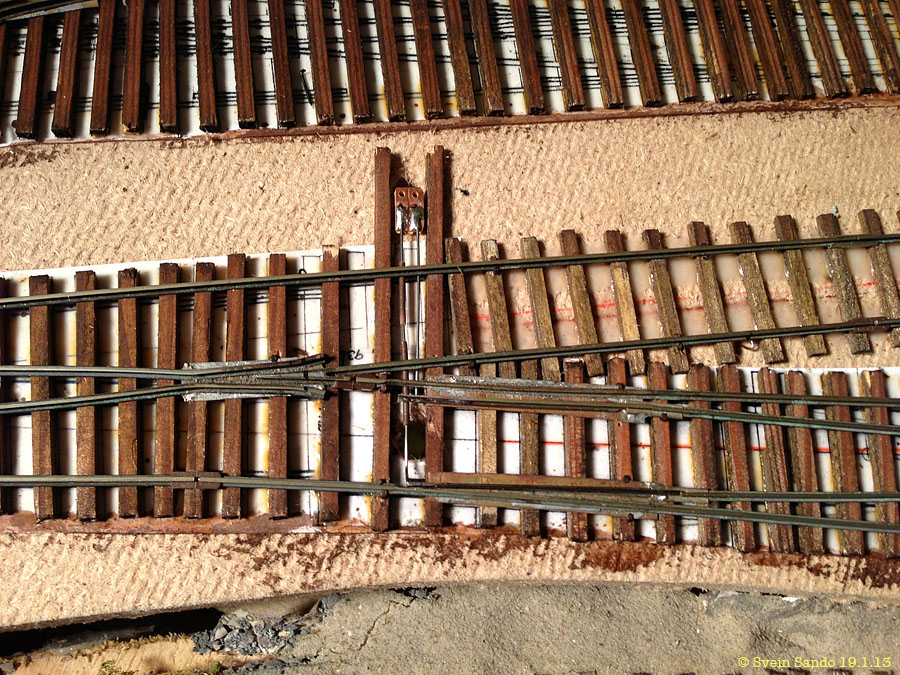 Ideelt burde vekselomleggingsloddet/motoren (prototyp) ligge på motsatt side enn det jeg endte opp med. Men der var det ikke plass pga sporet som kommer opp fra Langlete stasjon. Høydeforskjell er det også, så her må det bli en forstøtningsmur. Den eneste muligheten var de å legge omleggingen på motsatt side mellom spor 1 og 2. Dette skjer av og til i 1:1 også når vekslene ligger så trangt som her. Det innebærer en ganske lang omleggingsstang. Jeg valgte derfor en stang fra hver av tungene, og så samle dem sammen der aktuatoren fra vekselservoen kommer opp (på vekselloddets plass). For å hindre elektrisk kortslutning siden tungestengene er elektrisk ledende, måtte den ene isoleres der den kan komme i kontakt med skinnen over. Det ble ordnet med at jeg trakk isolasjonen av en vanlig tynn ledning, og så trakk den over 0,5 mm pianotråden som er brukt som tungeomleggingsstenger. Pianotråd er meget stiv, så det kan hende at det hadde gått med én felles stang.