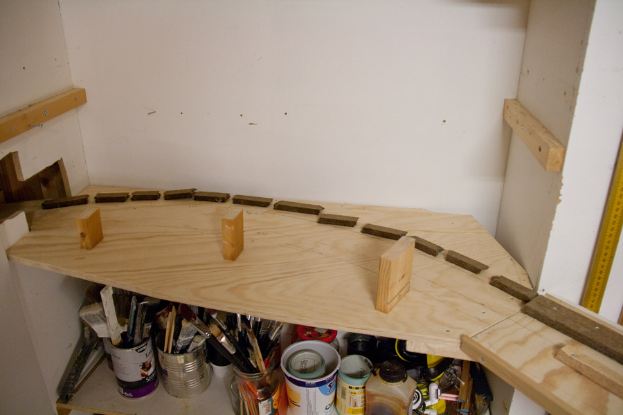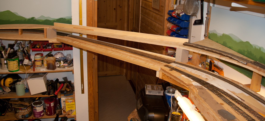 Sporunderlaget for sporet fra horisontalen ved Langlete stasjon og ned til Fremo hp (grønn linje på sporplanen) ble skåret til og montert nesten ferdig i løpet av et par timer kveld. Siden det sporet blir det lavestliggende, måtte jeg starte med det. Tegningen av anlegget gav de viktigste målene for å tilskjære platene, men finjusteringen måtte gjøres på stedet. Jeg har laget meg en mengde papp kurvelinjaler for nesten alle tenkelig kurveradier. Da er det enkelt å streke opp en korrekt senterlinje som sporet skal legges etter senere. Man ser to slike papplinjaler i kurven til høyre som skal ende i et Fremo-tilkoblingsstykke. Endestykket ble montert dagen etter og gitt egne ben, kanskje inntil Fremo-utstikkeren kan forankres godt nok i omliggende anleggsdeler og henge, slik at beina kan fjernes.