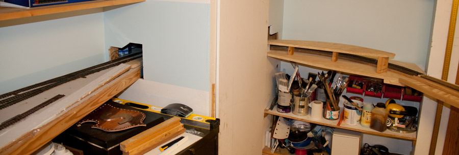 Nytt er et sidespor fra Fremo hp og tilbake til under anlegget men oppå topphylla på den ene arbeidsbenken. Et par veksler her, og jeg har en skjult oppstillingstasjon. Bruk av den fordrer imidlertid minst en Fremo-modul tilkobelt.