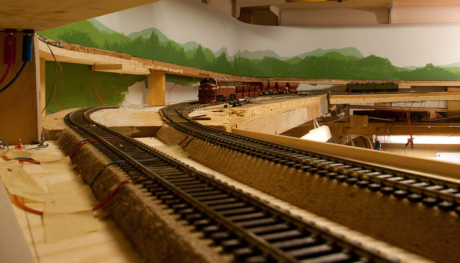 De fleste sporene er lagt, men det mangler en del sammenknytninger mellom sporene her og der. Bakgrunnen er på plass helt runt, og det gjorde den estetiske opplevelsen av anlegget mye bedre.