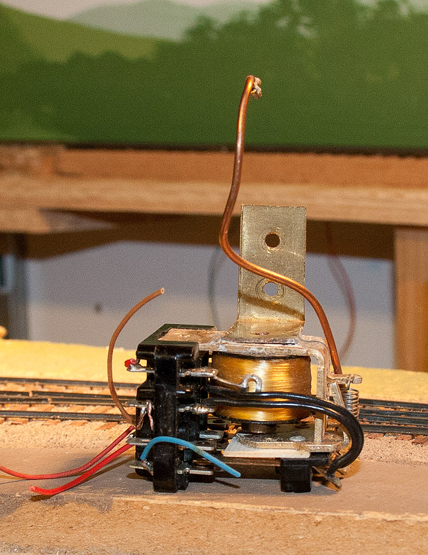 Vekselmotorene er noen hjemmelagde jeg brukte på et tidligere anlegg. Det er gamle 24V industrureleer som jeg har påloddet en tykk kobbertråd på vippa. Når releet ligger til den ene eller andre posisjonen, slår kobbettråden tilsvarende ut. Ved å gjøre tråden litt lang, blir det også litt utslag på den. TIl denne er det loddet et messingrør på ca 1,5 lengde. Fra stillsvilla på vekselen lar jeg henge ned gjennom hullet under den en pianotråd som bare har en liten vinkel på toppen slik at den kan bevege seg helt fritt i vertikalplanet. Denne tres ned i messingrøret. Fordi det er et rele som driver dette, får jeg gratis polarisering av skinnekrysset, og også evt. tilbakemelding dersom det er et flerpolet relé. Som oftes er disse releene 3-polede.