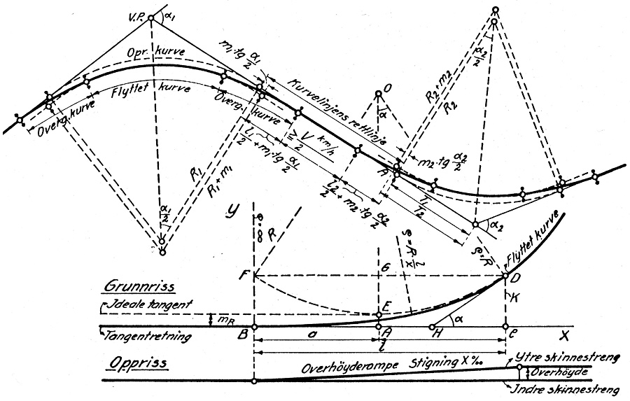 Tegningen er hentet fra prof. Kolbjørn Hejes Vei og jernbanebygging fra 1942, som var lærebok for NTH-studenter i vei og jernbaneteknikk. Den viser hvordan overgangskurven som går mellom punktene B og D på den nederste skissen tangerer rettlinjen i B og den faste radien i D. Den ideelle overgangskurven følger formelen y=x3/6RL, der R er kurvens radius og L er overgangskurvens lengde (l på tegningen).