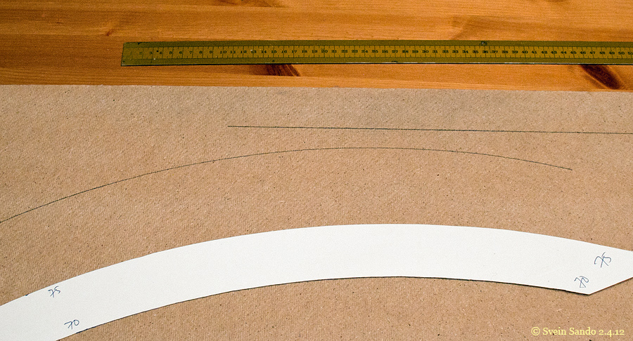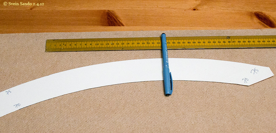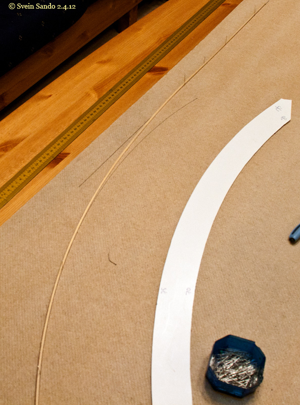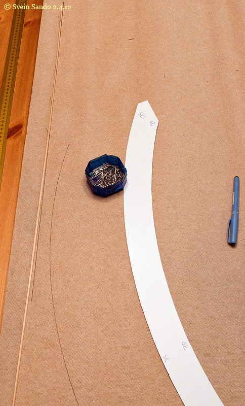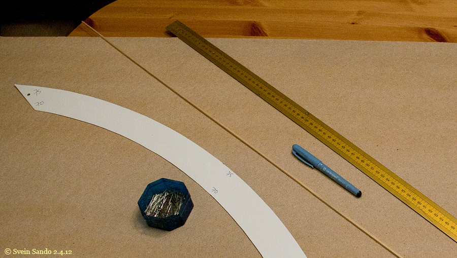 Utstyr man trenger: Knappenåler. Noe som kan merke av den faste radien (her en hjemmelaget kurvesjablon). Homogen list 1x1 eller 2x2 mm. Tusjpenn maks 1mm tykkelse. Rett linjal.
