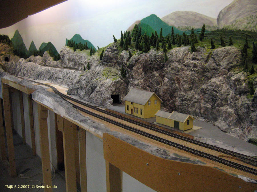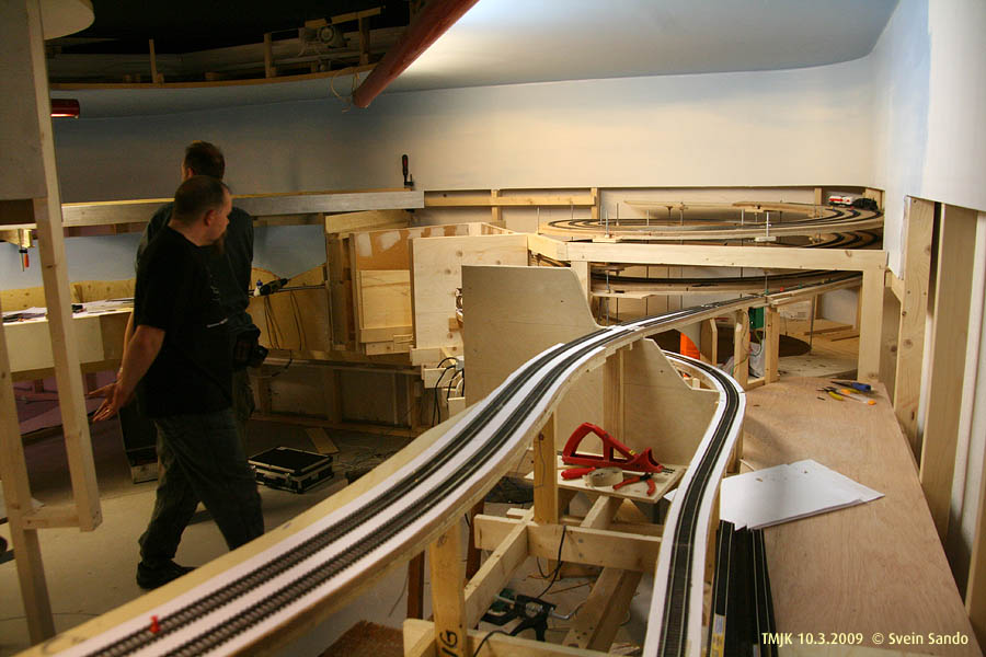 Glomgjordbanen 3.0 har et svært ambisiøst konsept, så det kommer til å ta tid. To år har vi holdt på når dette bildet er tatt. Fortsatt er det bare grovrammeverk med litt spor på. Det er imidlertid lagt mye arbeid ned i bakgrunner, himling og framføring av alt som trengst av elektrisitet til både anlegget, til belysning og vanlige stikkontakter. Anlegget skal være toetasjes bortsett fra på det partiet som her er avbildet. I bakgrunnen ses imidlertid helixen som forbinder de to etasjene med hverandre.