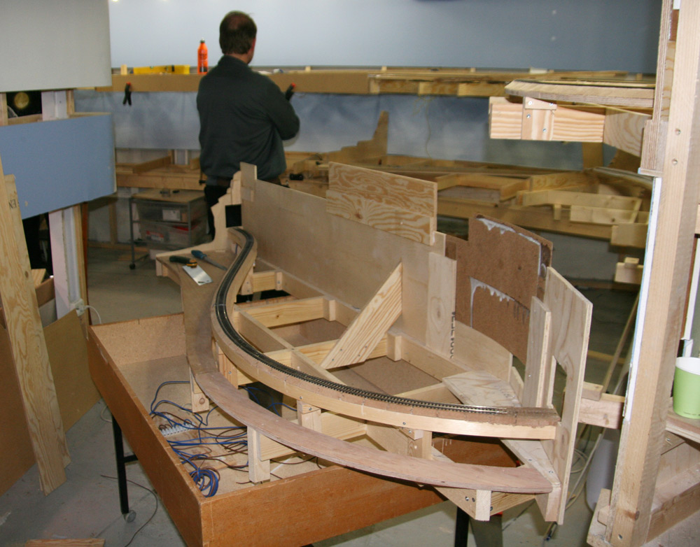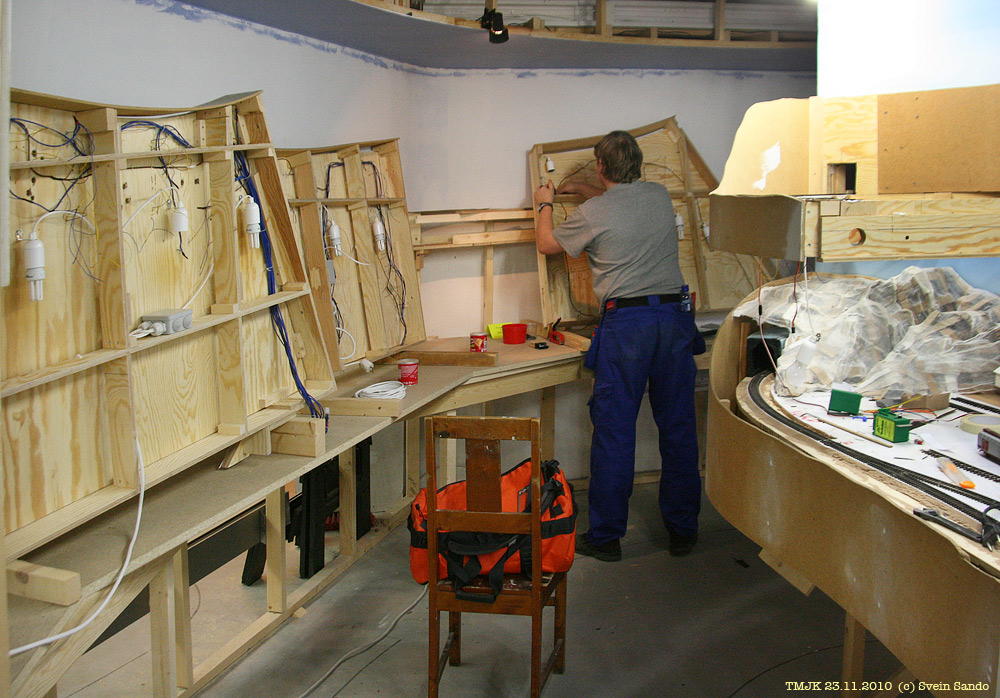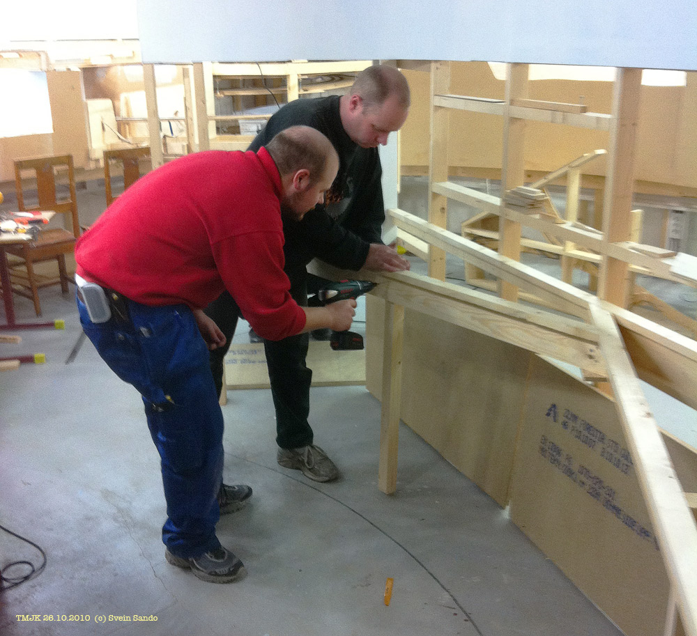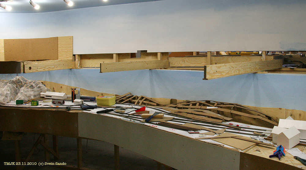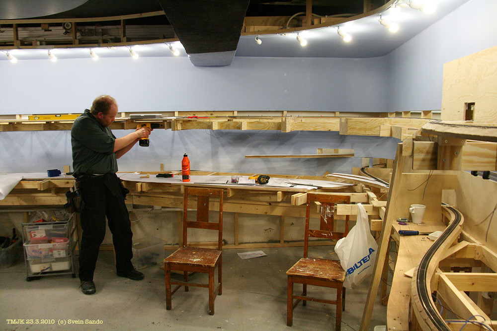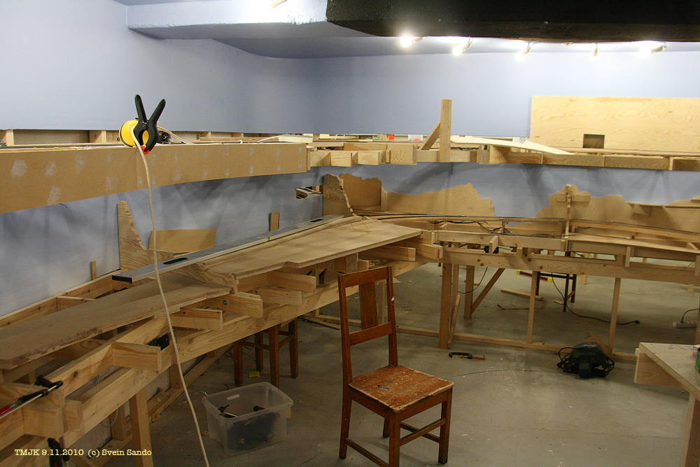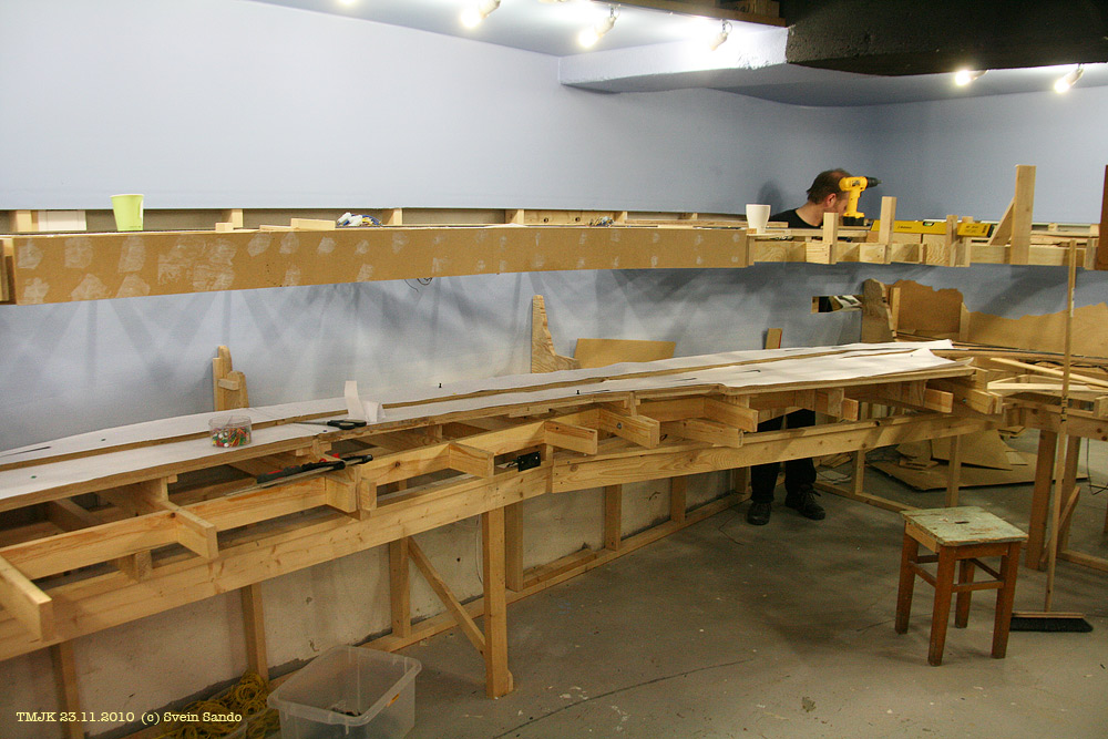 L-rammeverk ("kjelleren") ble satt opp på sidebaneveggene og så belagt med kraftige sponplater for å kunne fungere som midlertidig arbeidsbenk.