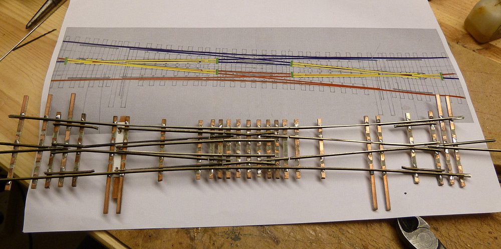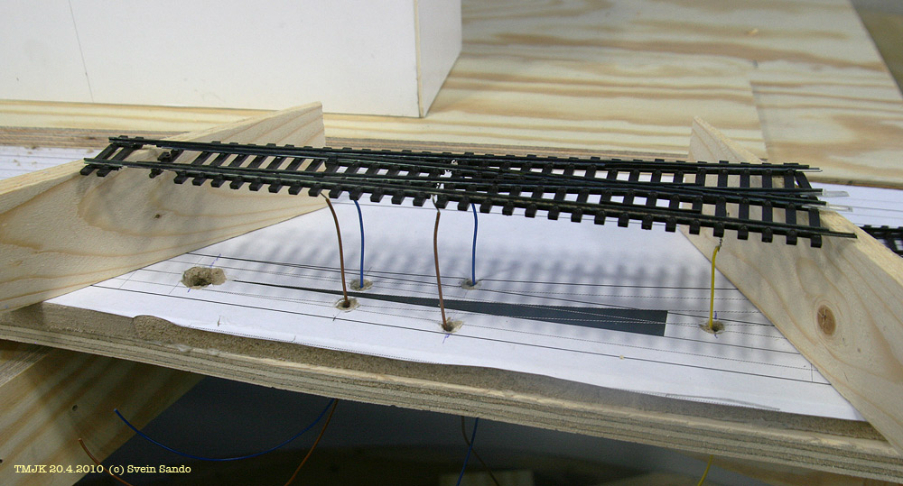 Legging av sporveksler på Ødsle. Peco-veksle ble behandlet endel før den ble lagt inn. En del sviller ble fjernet ved tungespissen for å kunne få de mer NSB-lignende. Hele vekselen ble brunert på forhånd og feedere loddet til også ved tungeroten for å sikre strømtilførsel i tungene og ikke stole på elektrisk kontakt gjennom at tungene ligger an mot stokkskinnen.