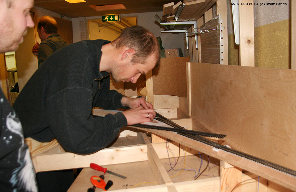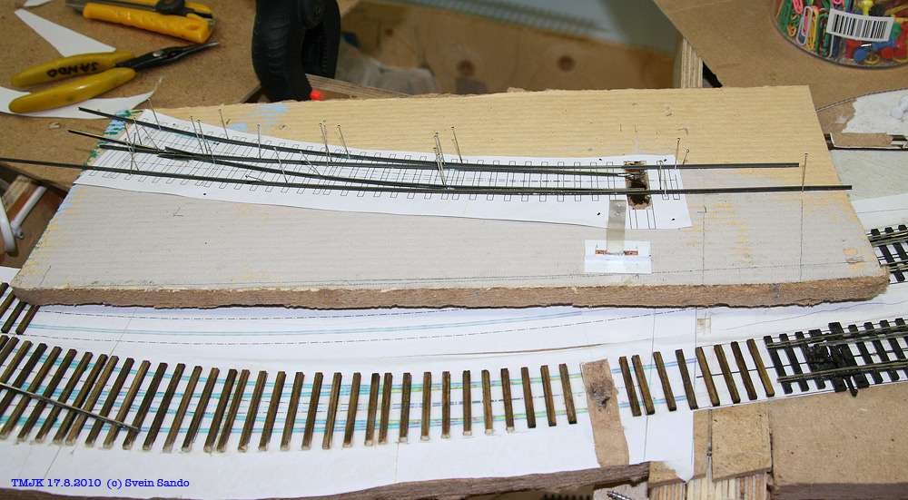 Sporlegging på Ødsle. Systemet med papirplott limt på underlaget som mal for plassering av skinnene vises godt her.