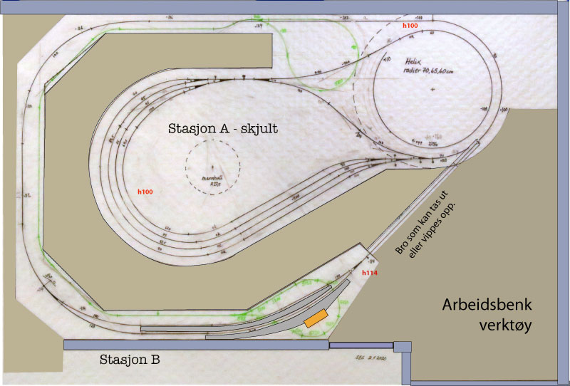 Heliksen, også kalt togheis, gjør det mulig å bygge anlegget i tre etasjer. Visuelt ser det imildertid ut som et to-etasjesanlegg da halvøya som har tre etasjer har bare de to øverste av synlige. Den ytre omliggende anleggsdelen er bare på to nivåer. Det gir rimelig god avstand mellom etasjene her (ca 50 cm mellom sportopp), mens det er ganske trangt mellom de to øverste planene på halvøya.