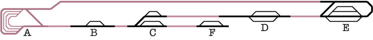Banestruktur. Lyserødt ligger i tunnel/er usynlig. Bare togspor vises.